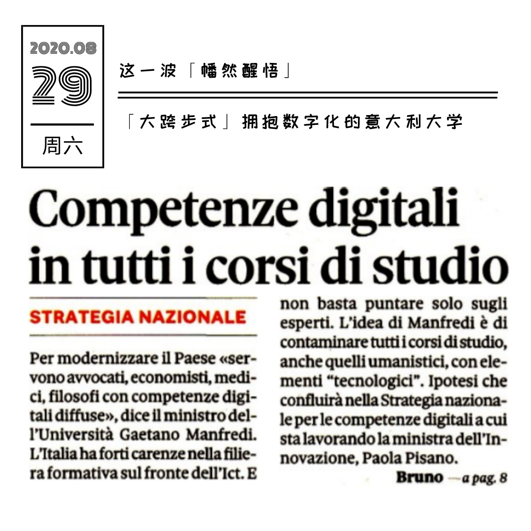 意大利大学及研究部长Manfredi表示:我们不仅需要大数据、数据安全和人工智能方面的超级专家,也需要有数字化技能的律师、经济学家、医生和哲学家,为我们的组织乃至国家注入创新力。所以,他倡议在所有的课程里都加入「数字化技能」培养这样一项硬性指标,并积极推动这个策略白纸黑字写到相关文件上。