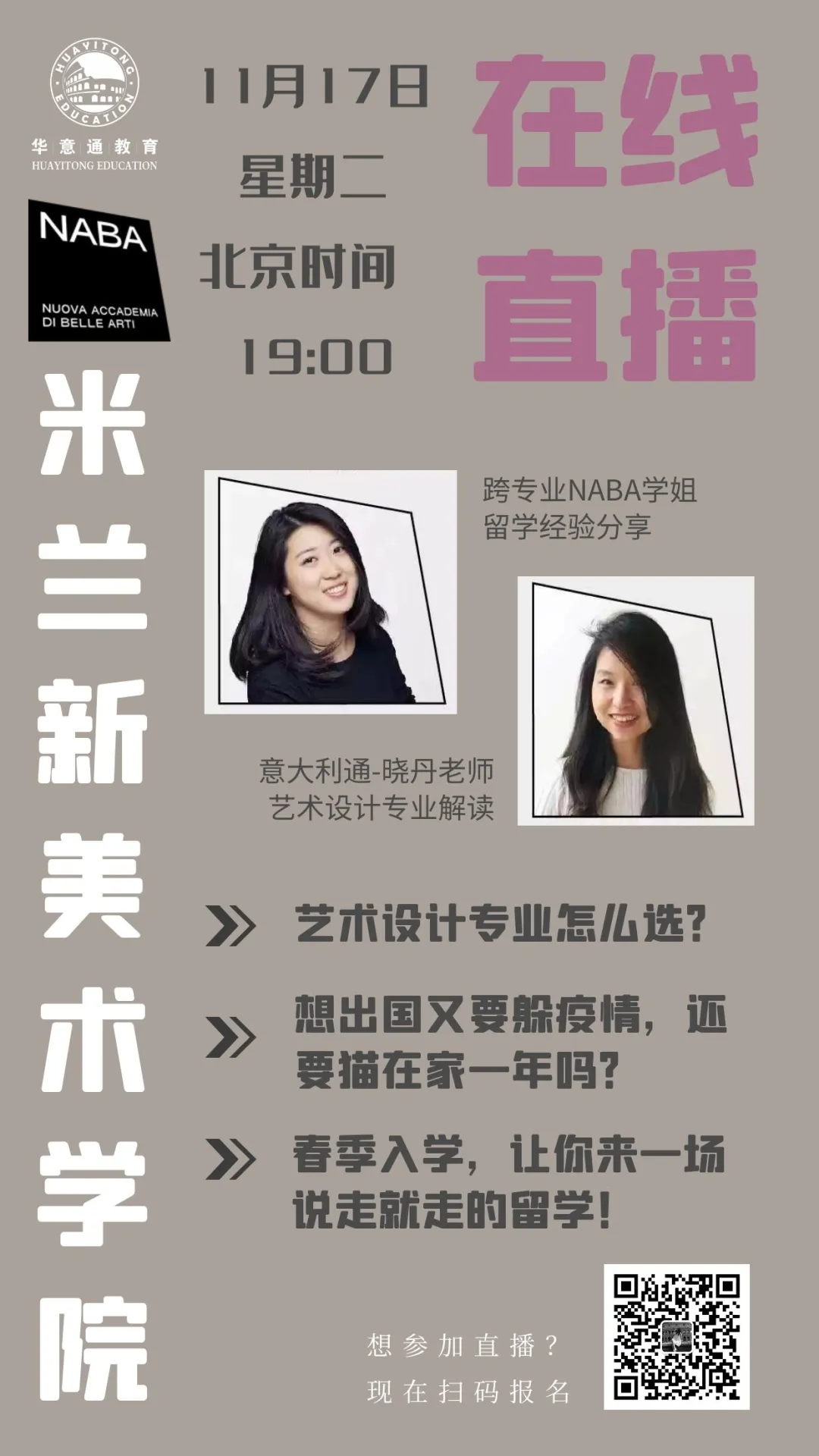 同时,还有NABA跨专业的学姐将用自己的亲身经历来为大家分享留学体验